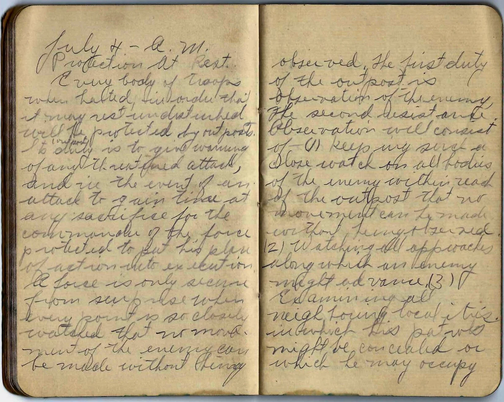 Partway through the notebook - in an entry dated July 4 - Elmer took notes on the subject of “Protection At Rest”. It exemplifies the training, as he would head the notebook with a different subject and then take the notes on that subject.